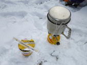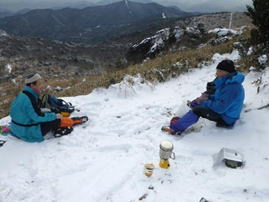 昼食タイム 10時48分 山頂でちょっと早い昼食。 雪山での温かいカップ麺は最高のご馳走だ。 疲れが吹っ飛ぶ! 楽しみの一つ |