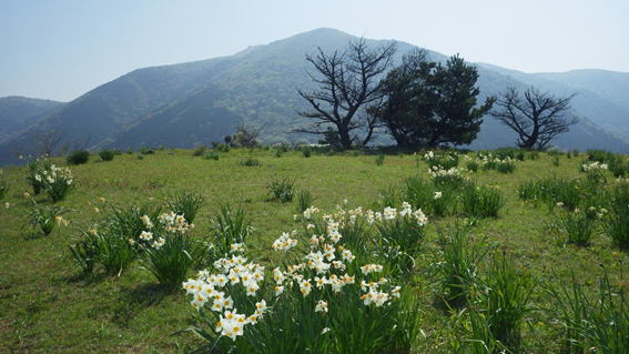 鷹取山山頂から八丁と福智山を望む 鷹取山の山頂には誰が植えたのか、水仙が花盛り