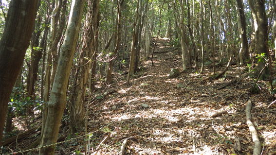 | 鷹取尾根の難所 9時10分 ロープが張られた急坂がある(約100m) 勾配か急で、足下がズルズルと滑りとても歩き難い この急坂をクリアするとあとはまた緩やかな勾配の尾根歩きに戻る。 |
