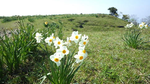 分岐を右に曲がって3分程で鷹取山の山頂に到着した。水仙が気持ちよさそうに揺れていた。