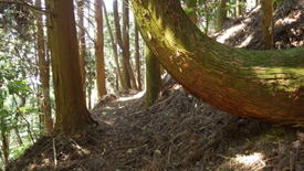 登山口からしばらく薄暗い竹林帯を歩いて上る。登山道には山藤の花びらが点々と落ちている。右下から沢の流れる音が聞こえてなかなかいい感じだ。 |