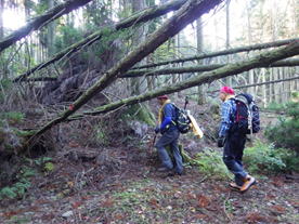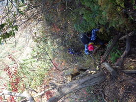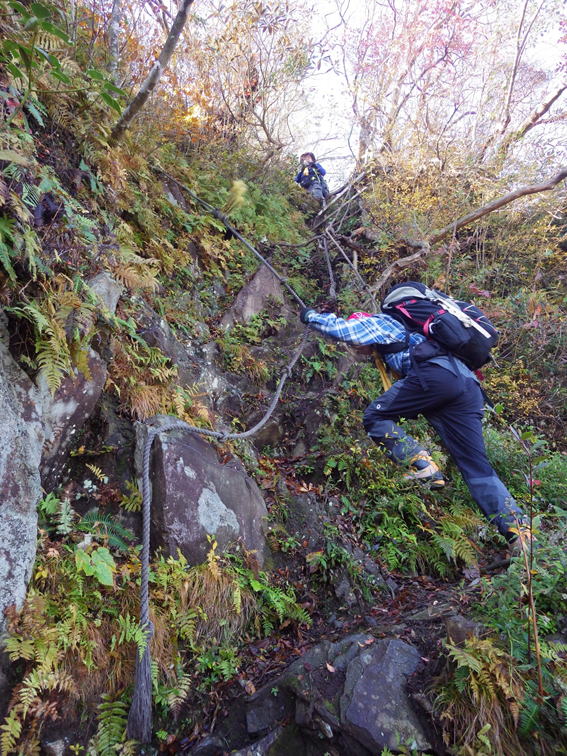 ほぼ垂直な崖を上る 9時48分 ロープに頼らず三点支持を忘れずに!