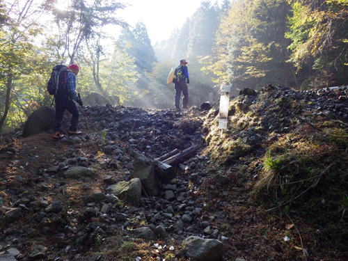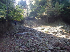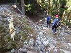 荒れた林道支線 8時43分 もはやこの道は林道とは呼べない。ガレ場である。 |