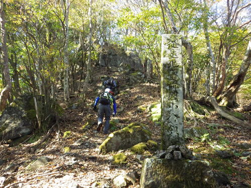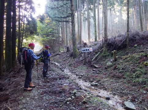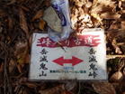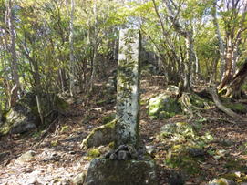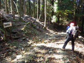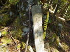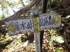 岳滅鬼峠の標識 目指す岳滅鬼山は右へ。左に進むと籠水峠と表示されている。H師匠が「籠水方面はちょっと怖いところが・・」と呟いた。 鬼杉に通じる籠水峠方面は<難・荒路>と書いてあり、落ちたら終わりの難関の岩場があるそうだ。一般の方は行かない方がいいだろう。私も行ったことはなく、想像するだけだがたぶん尻込みするだろう。 |