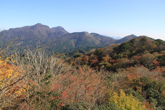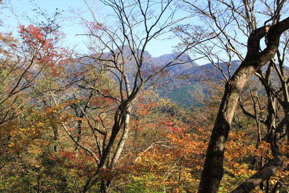 紅葉した樹林の間から英彦山を望む 9時20分 とても綺麗だ