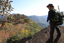 シークレットビューポイント 8時11分 黒岩山への分岐表示を背に小高い丘がある。そこはH師匠お勧めのシークレットビューポイントだ。「行ってみよう!」とそこに寄り道をした。渓谷を挟んで障子ヶ岳方面を見ると、迫力あるバッドレス(垂直に近い岩壁)が目に飛び込んでくる。以前はよく見えていたそうだが、現在は木々が茂り視界不良だ! |