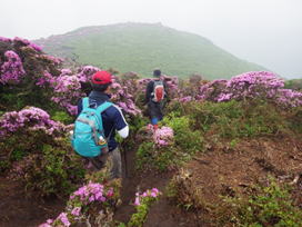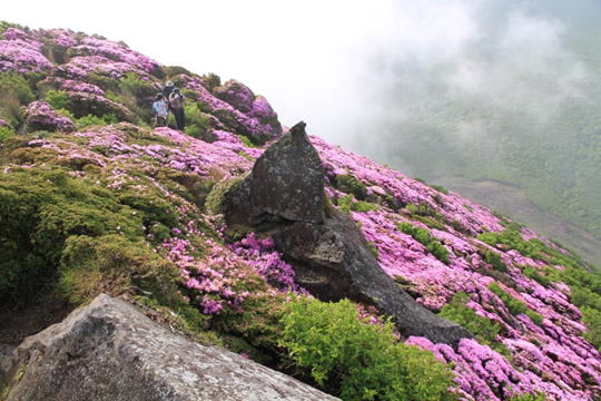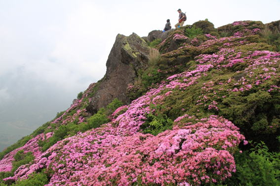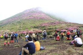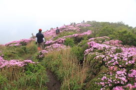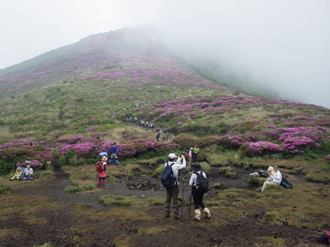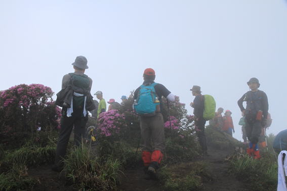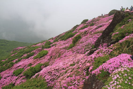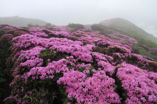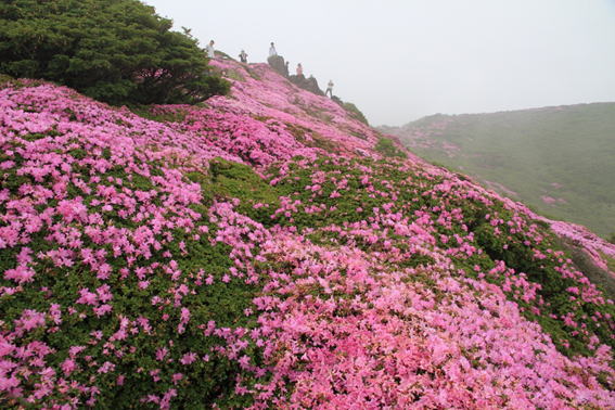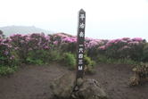平治岳山頂より本峰斜面を望む 8時11分 霧の中で咲き誇るミヤマキリシマ |
