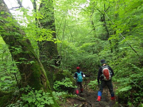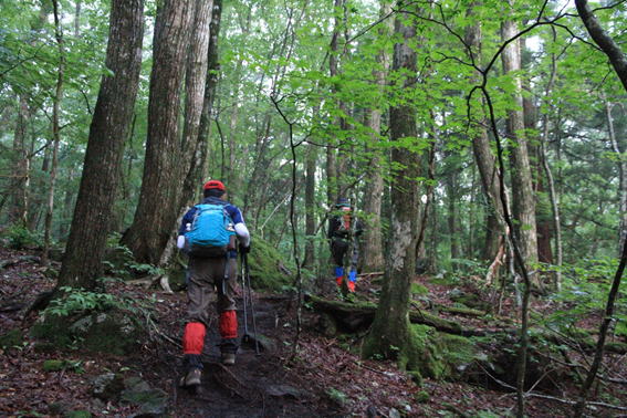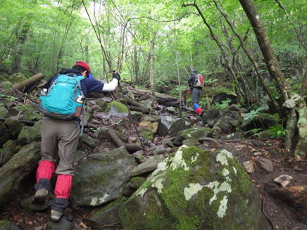 大戸越(うとんごし)を目指す 6時25分 濡れた不規則な岩、しかも苔むして歩き難い |