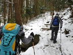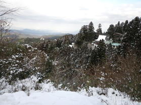 奉幣殿が見える展望所 8時45分 空はどんより曇っている。ここにはひさしのあるベンチが一つ備えつけてあった。 森の中に雪を被った英彦山神宮奉幣殿が見える。 なかなかの風景だ。これから本格的に登山道を進んで森の中へと入って行くが、思ったより登山者は多くない。 お天気は回復傾向なので期待して進んで行く。