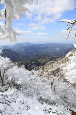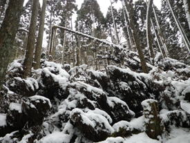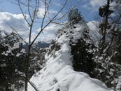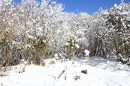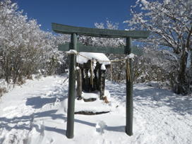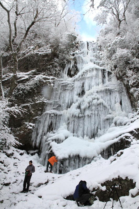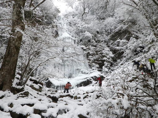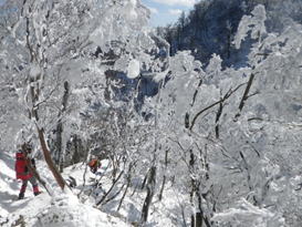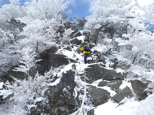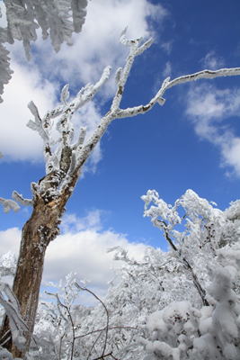 | 知る人ぞ知る「幻の滝」が今年マスコミで報道され一躍ブレイクした。その名は「四王寺滝」と命名されて、今や平日でもたくさんの人々が訪れている。今回はその氷瀑を鑑賞し、南岳から中岳へと足を伸ばした。天気予報通り午後からは晴天となり、スカイブルーに映える樹氷は最高の表情を見せてくれた。 |
