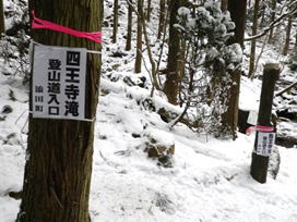 4、四王寺滝登山道入口 9時17分 小さな沢を渡ると左側の2本の木に「四王寺滝登山道入口」の表示が貼ってあった。 |