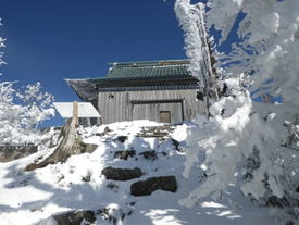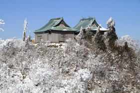 中岳上宮(左)と樹氷で真っ白な北岳(右奥) 13時23分