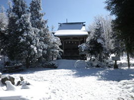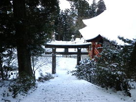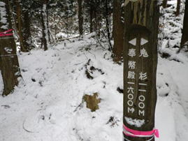 奉幣殿 8時28分 駐車場から宿坊跡の近道を歩き、約20分で奉幣殿に到着した。途中から雪道となるが、雪の下はアイスバーンなのでとてもよく滑る。アイゼンを装着するタイミングを考えながら恐る恐る歩いてとうとうここまで来てしまった。 表参道の長い石段を見下ろすと、雪に覆われ純白の石段と化していた。この石段の出発点には「銅(かね)の鳥居」がある。 |