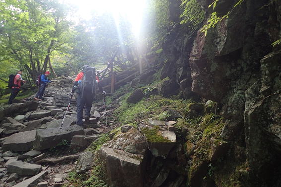 中岳山頂に向けて最後の岩場 10時18分 倒木を避けながらルートを進む |
