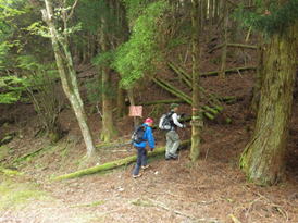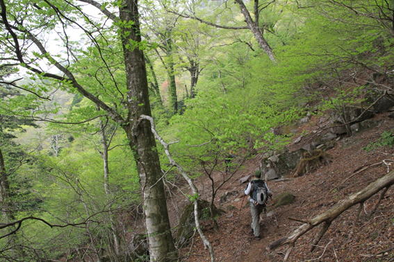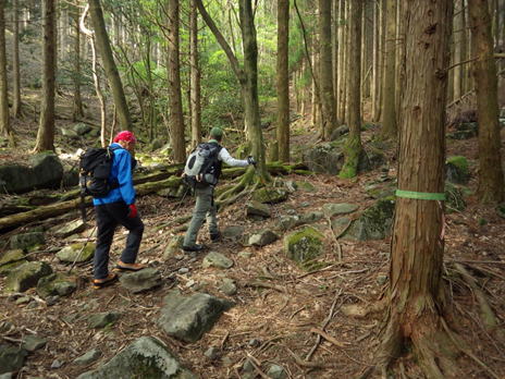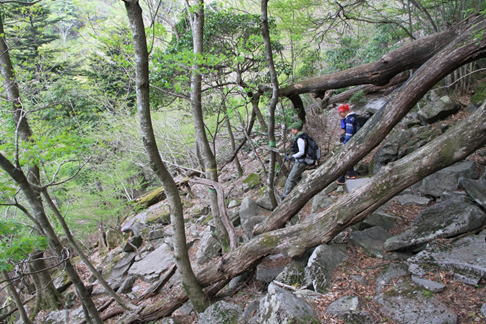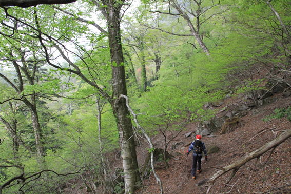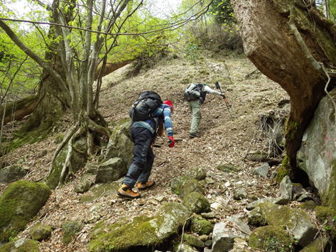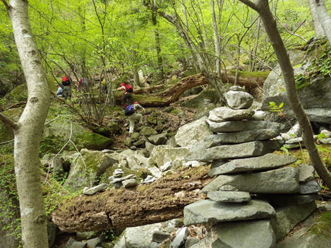 新緑が太陽の光でキラキラと光る。しばらくその素晴らしい光景に感動しながら歩いていると、突然大きな岩がゴロゴロとしたゴーロ帯に行き着いた。先行の二人を見ているとそのゴーロ帯の中を下って行くではないか!確かに赤テープが木に巻いてある。間違いなく登山道なのだが、岩が不規則でとても歩き難かった。転倒しないように足下注意だ!