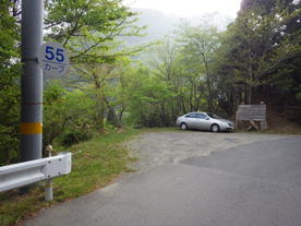 薬師林道 7時49分 ここから薬師林道に入る。林道入り口で裏英彦山道への小さな表示を見つけた。バイクの轍の跡がある。通行禁止のはずだが・・・。 古びた表示 |