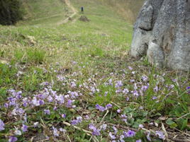 石灰岩の横にスミレが群生している。薄紫色の小さな花がとても健気で可愛い。H師匠は既にこの先の分岐まで進んで待っている。