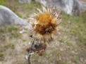 この分岐から左に進めば井手浦、大穴、塔ヶ峰方面、右に進めば中峠へと続く。すぐ近くで、野焼きのせいで焦げたのか? (それとも枯れたのか? )ハバヤマボクチを見つけた。