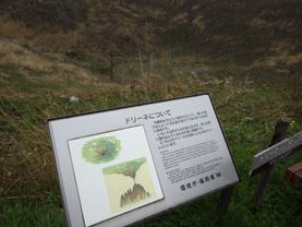 いろいろな形のものがありますが、中には深く落ち込んでいるものがあり危険です。2つ以上のドリーネが合体したものをウパーレといいます。(説明看板より)