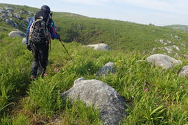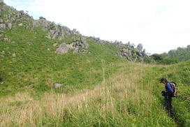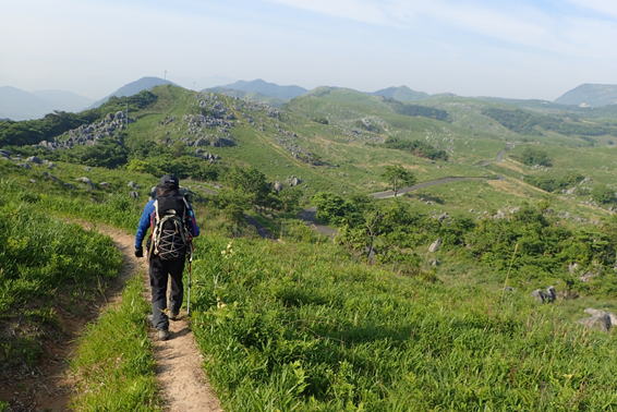 遠くを眺めると、この先にある窪地(ドリーネ)の斜面にシランがたくさん咲いている。 |