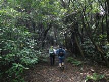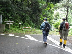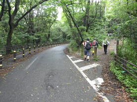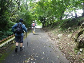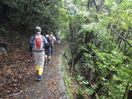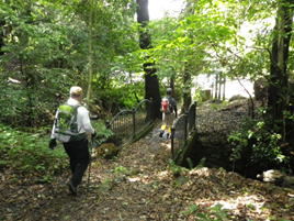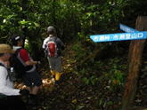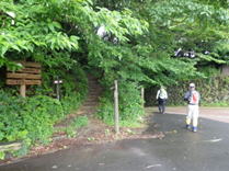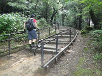 長くて急な階段を上って行く 9時45分 緑濃き森の中、急登を全員寡黙になって上って行く。 お互いを気遣う様子もない。遅れをとってはいけないと自分のことで必死である。 このふれあいの森コースは今日の行程の中で一番の踏ん張りルートだと思う。 汗は拭いても拭いても噴き出してくる。 「ハァーハァー」と息遣いが荒い。 気がついたら4人がバラバラになって上っていた。 |