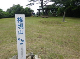 8、権現山山頂 10時57分 618m 誰もいない山頂。右奥の展望台で休憩。 ![]() |