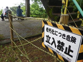 冒険のもりのゲートをくぐる 12時09分 これより山頂まで長い階段を進んで行く。 変則階段 |