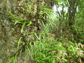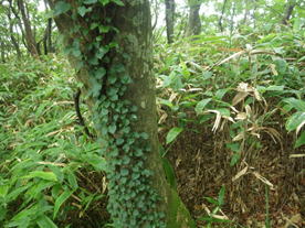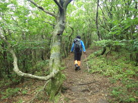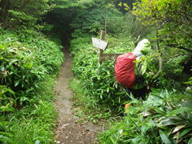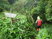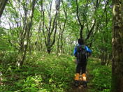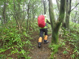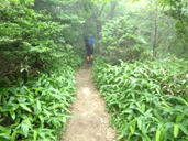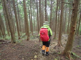 植林帯を下って行く 11時08分 あとはどんどん下るだけ。幸いなことに下るにつれて雨も止んできた。植林帯を抜けるとまた自然林の中へ突入! 足下注意! |