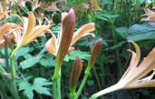 丸太の橋を渡ると・・・ 8時10分 すぐに足下にオレンジ色の花が出迎えてくれる。道沿いにずっと続いて咲いている。 |