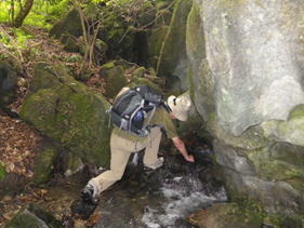 こうぞう岩(水無の湧水) 11時51分 湧水をペットボトルに入れて持ち帰る。 |