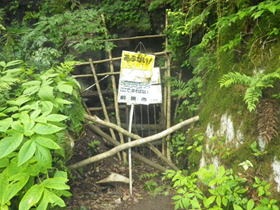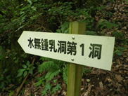 8、水無鍾乳洞第1洞 12時04分 4〜5人がこの穴の前に立っていた。近づくと、この穴からとても冷たい風が吹いてくる。 最初は冷たくて気持ち良かったが、3分もしないうちに寒くなった。あわててこの場所を離れると一気に、む−っと暑くなって、メガネが雲ってしまった。これぞ天然クーラー。 是非自宅に欲しいものだ。 |