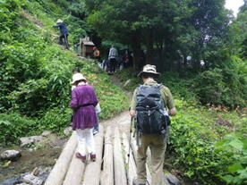 丸太の橋が滑る 8時12分 丸太が少し朽ちている、しかも濡れていて、ツルツルと滑る。皆さん慎重に渡っている。 |