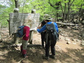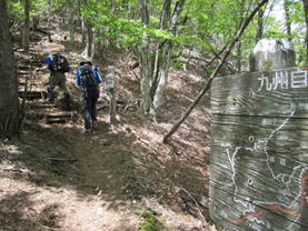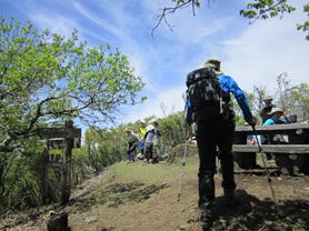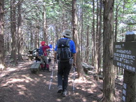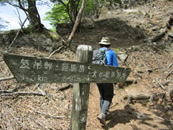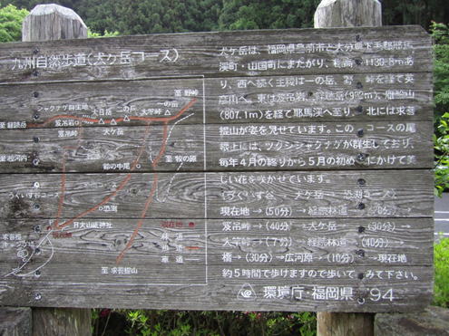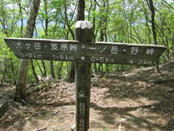 我々はこのまま尾根を歩き「一の岳」へと向かうが、この大竿峠からは犬ヶ岳登山口に続く「恐れ渕コース」がある。このコースを利用する人も多い。 結局このご夫婦と一の岳から求菩提山下山までご一緒することになった。このご夫婦はとても足が速く、私はついていけなかった。 |