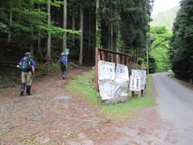犬ヶ岳登山口 7時42分 舗装道路から左の犬ヶ岳林道に入る。 |