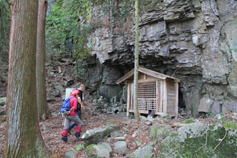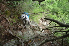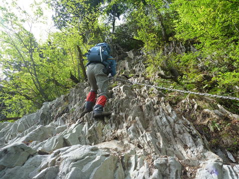 5、笈吊岩(おいつりいわ)挑戦 9時17分 私たちの前に7人のグループが歩いていたので、ゆっくりついて行った。ところが、このグループは笈吊岩を通り過ぎて、う回路へと進んだ。という訳で、私たち3人だけが笈吊岩に挑戦することになった。太い鎖を両手に持って岩をよじ登ったが、2メートルほど登った時に後悔した。思ったより足場が悪く、鎖に頼らなければ登れない。マジで必死だった。怖かった。 |