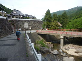 求菩提山を見上げる 7時26分 橋を渡りながら振り返ると、求菩提山が真上に見える。本日の最後はここから下山する。 |