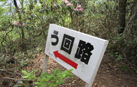 | この笈吊岩(おいつりいわ)の由来は、その昔、修験者たちがあまりの険しさに背負っている「笈」(四角い箱のようなもの)を背から下し、ひもで吊るして引き上げたと言われているところから、その名前が付いたと言われている。 今回実際に上って見たが、鎖があるとはいえ決して油断は許されない。上り終えるまで緊張の連続だった。上り終えて、「滑落事故多発」の看板を見た時、本当に「ゾッ」とした。(実は上る前にもこの看板があったのだが、見落としていた) ※この岩登りは挑戦しないことをお勧めします。 ちゃんと「う回路」があるのでそちらを利用する方が間違いなく賢明です。 という訳で、少々安堵し尾根歩きに入った。そこにはシャクナゲの花々が待っていた。 9時37分 シャクナゲを観賞し、写真を撮りながらゆっくり尾根を歩くことができ、とても気分がよかった。 |