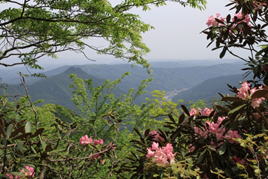 笈吊岩の上から求菩提山(右側のピーク)を望む。 ツクシシャクナゲが綺麗だった。