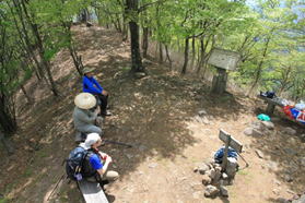 7、大竿峠に到着 11時01分 犬ヶ岳山頂から20分。休憩する人が多い。 |