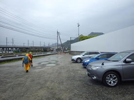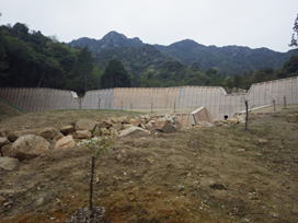 土砂崩れの大きな傷跡 13時49分 民家が近い。土砂崩れの際、地元の方たちは生きた心地がしなかったのでは? 工事中 |