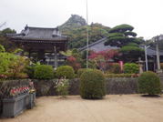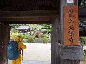 2、天徳寺の山門前 8時41分 山門の上に右田ヶ岳への最初のピーク「石船山」が聳える