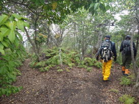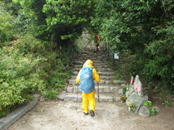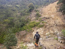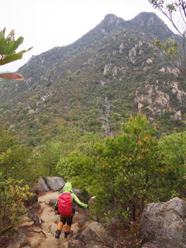 雨が止んだ 10時45分 断続的に降っていた雨が登頂前にとうとう止んでくれた!ラッキー!レインウェアの上着を脱ぎ、ホッとして足取りが軽くなる。 ![]() 右側が切れ落ちているロープ場も、少々緊張したが無事にクリアした。10時52分 |