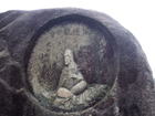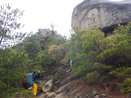 頭上の奇岩に観音様が刻まれている 9時08分 見上げて撮影をするYさん |