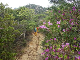 ミツバツツジと右田ヶ岳 13時20分 右田ヶ岳の稜線を眺めながら下る
