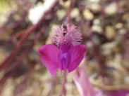 後姿で「ハイ、ポーズ!」 11時34分 右田ヶ岳山頂の岩場に立って三人でポーズ。 画になりませんね(笑)。 山頂大岩の下でひっそりと咲く小さな花を見つけた。 シュンラン |