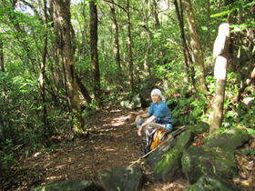 森の中に入って行く 6時38分 登山口から森に足を踏み入れると、登山道は大きな溝のようにえぐられていた。 |