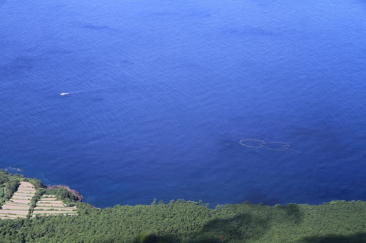 海が青い 9時16分 海に浮かんでいる輪になったものは養殖用の生簀だろうか?