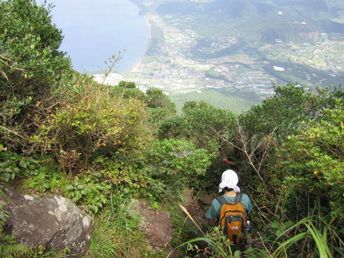 7合目を過ぎると初めて海への展望が開けた。朝日に輝く東シナ海である。