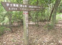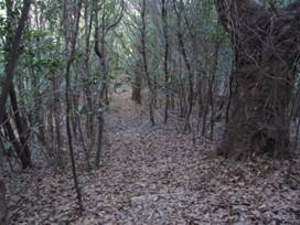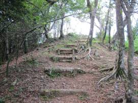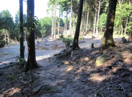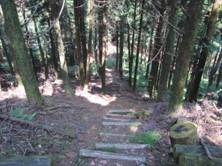斜面で休憩 7時21分 まだ早朝というのに気温が高い。しかも登山口からずっと急坂が続く。汗が滴り落ちる。 ここでリュックを下して5分休憩。斜面を見上げると杉林がある。 登り始めの急坂はいつも堪える。まだまだ先は長いのに・・・。ちょっと気持ちが萎えそうになる。 |