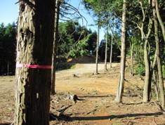 少し歩くと、再度、林道に出た 8時03分 どうやら災害復旧の工事用の道のようだ。 ここも道路を横切り杉林の中へと進む。